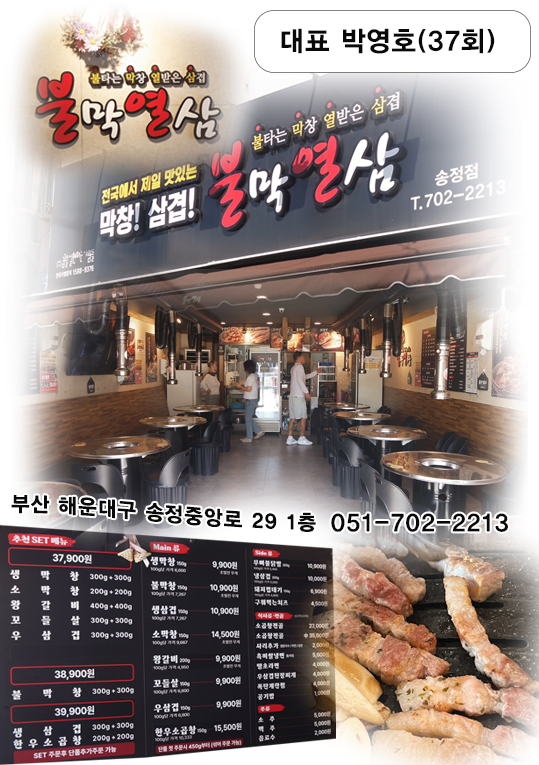 막창삽겹 분류 불막열삼 (막창&삽겹) 대표37회 박영호 컨텐츠 정보 1 조회 목록 본문 불막열삼 (막창&삽겹)대표37회 박영호 관련자료 댓글 0 등록된 댓글이 없습니다. 로그인한 회원만 댓글 등록이 가능합니다. 목록